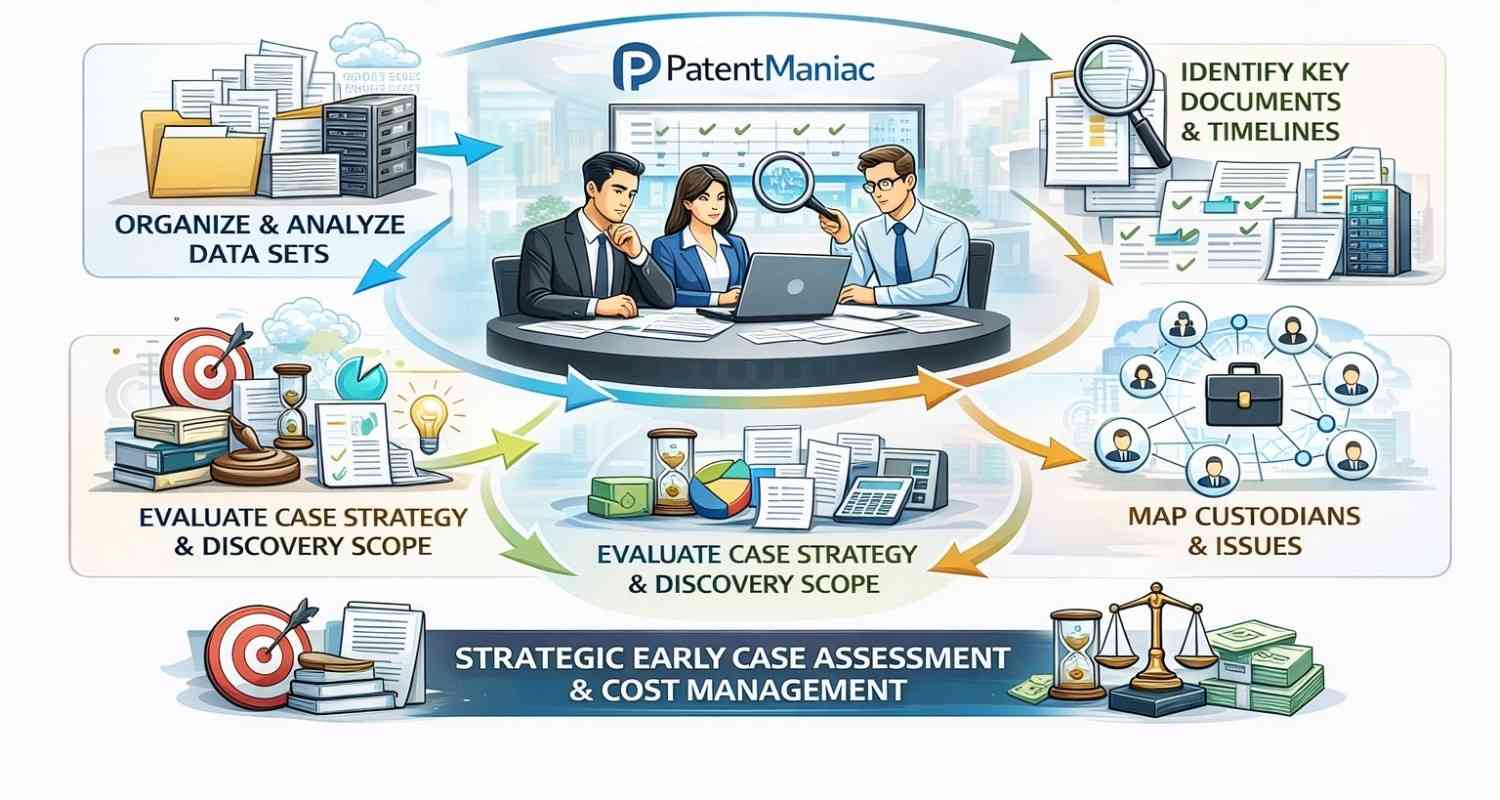 PatentManiac assists litigation teams with Early Case Assessment by organizing and analyzing data sets to identify key documents, timelines, custodians, and issues at an early stage. This enables attorneys to evaluate case strategy, scope discovery, and manage costs effectively.