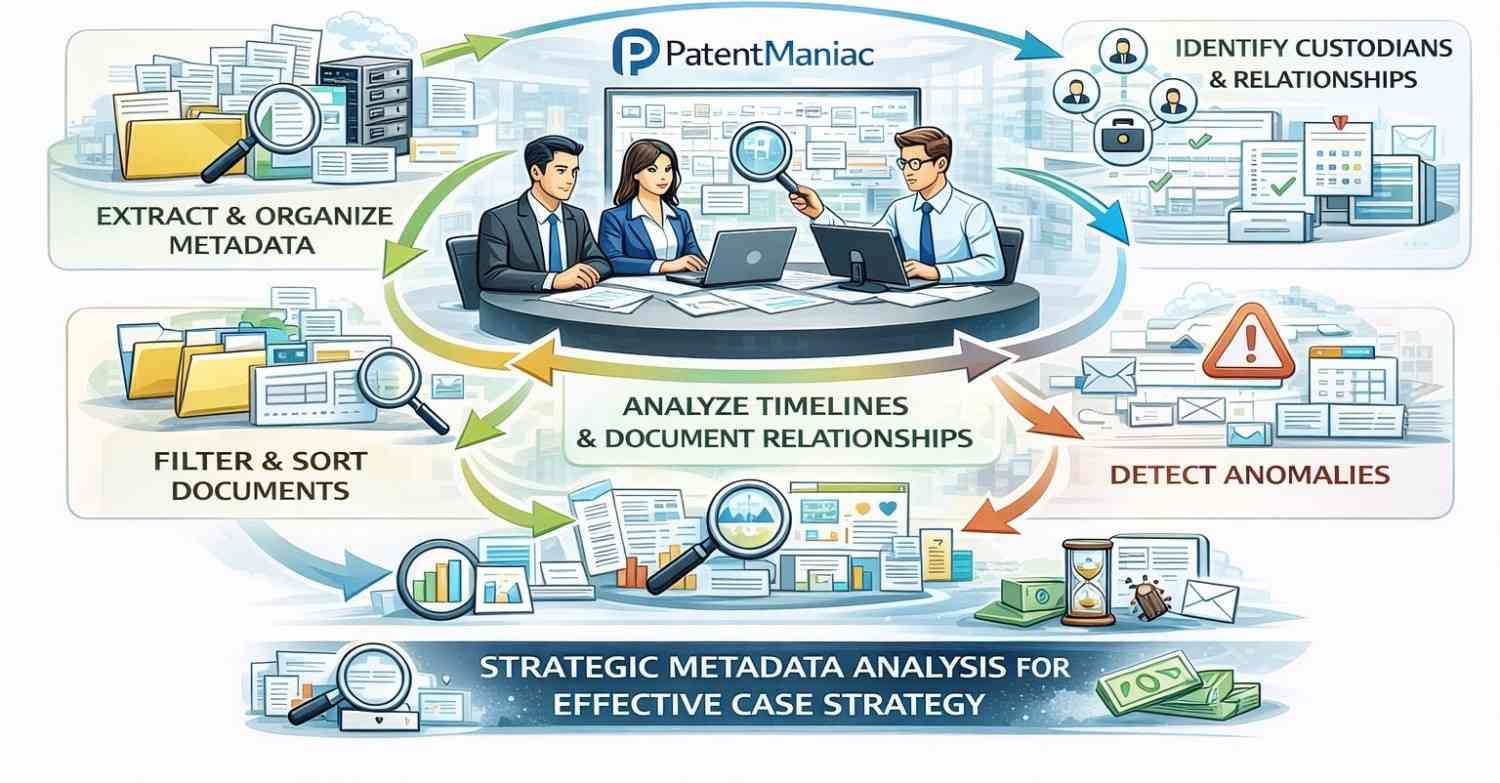 PatentManiac extracts and organizes metadata from documents and emails to support filtering, sorting, and analytical review. Metadata analysis assists litigation teams in identifying timelines, custodians, document relationships, and anomalies relevant to case strategy.